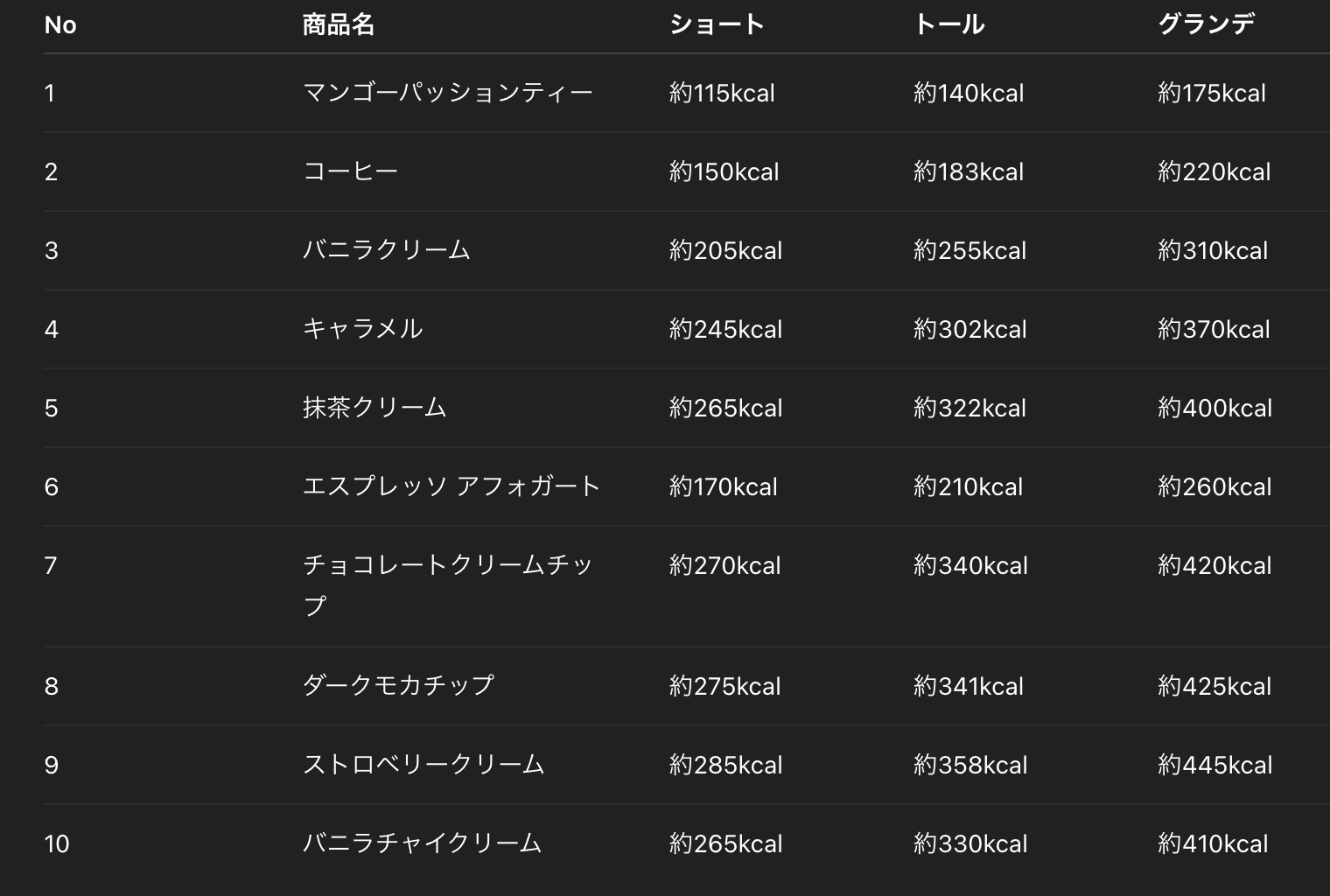 サイズ別カロリー比較表(ショート/トール/グランデ)